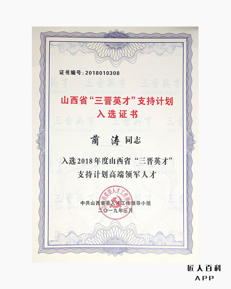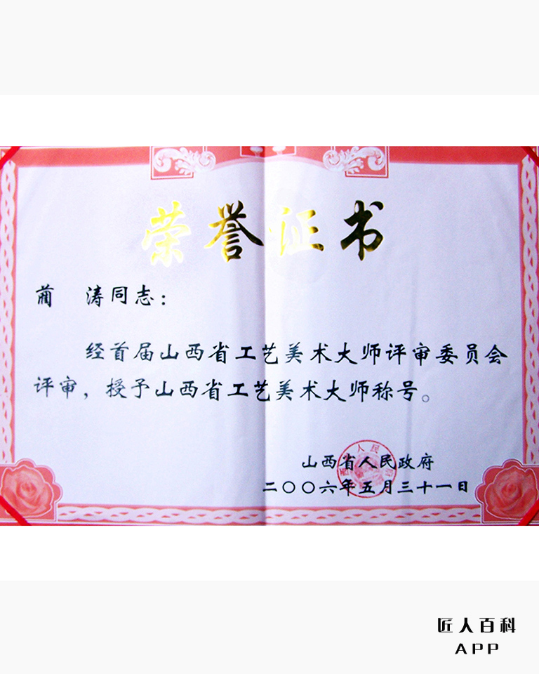 2015年5月,山西省总工会授予蔺涛“传统工艺(手艺)大师创新工作室”。