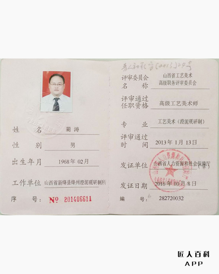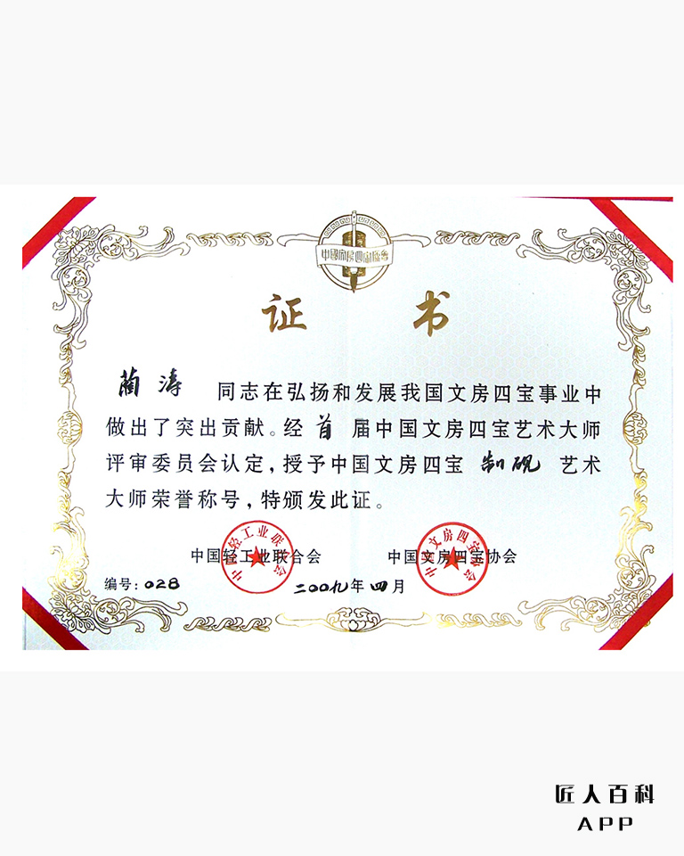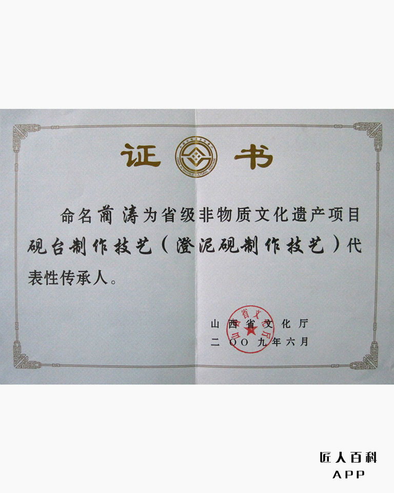 、 国家级非物质文化遗产(澄泥砚制作技艺)省级代表性传承人