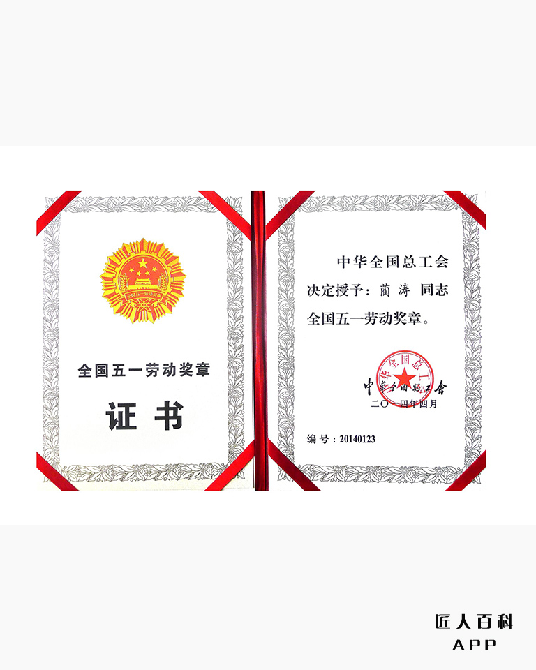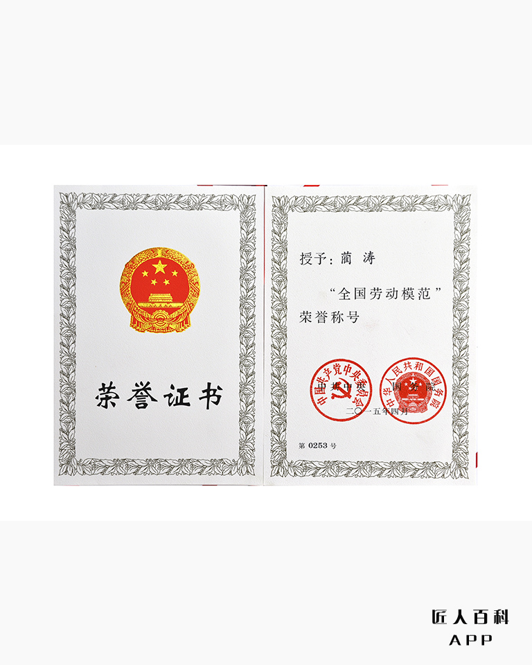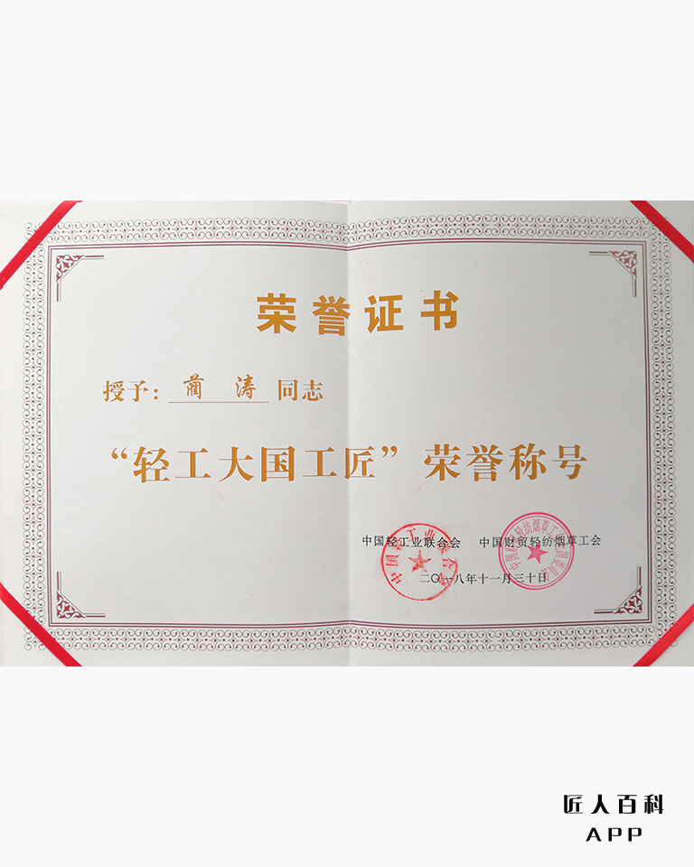 2018年10月,中国轻工业联合会授予蔺涛首届轻工“大国工匠”荣誉称号。