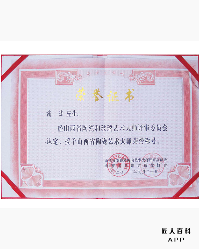 2010年,绛州澄泥“东方之冠砚”被上海世博局选为订制国礼;六次获得联合国教科文组织“世界杰出手工艺品徽章”。