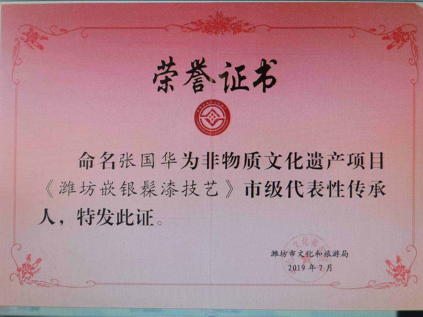、 国家级非遗项目潍坊嵌银髹漆技艺市级代表性传承人