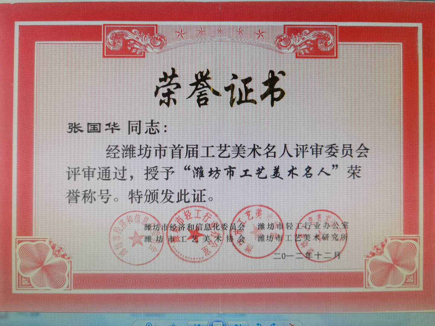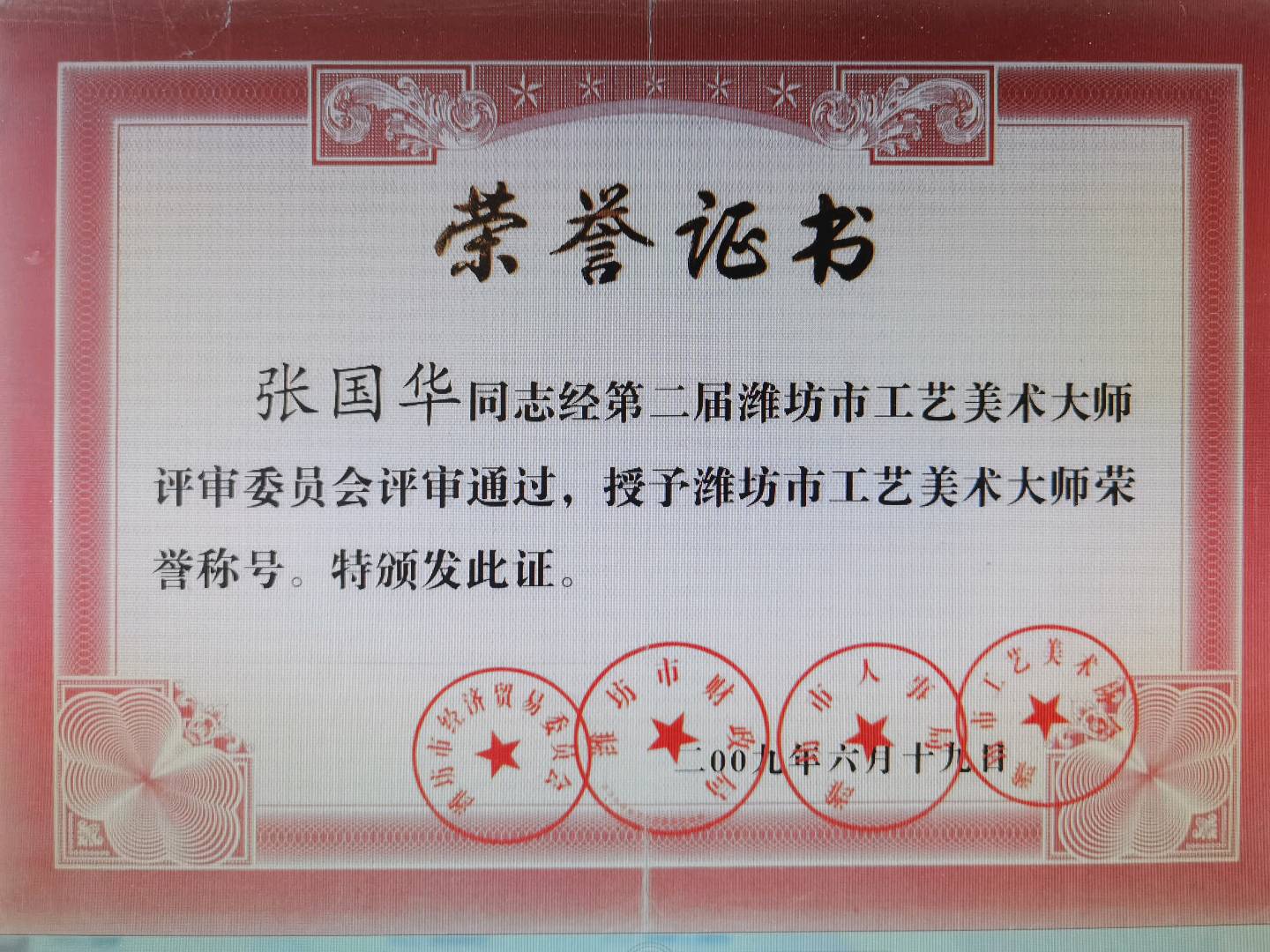 2009年6月被授予“潍坊市工艺美术大师”荣誉称号;