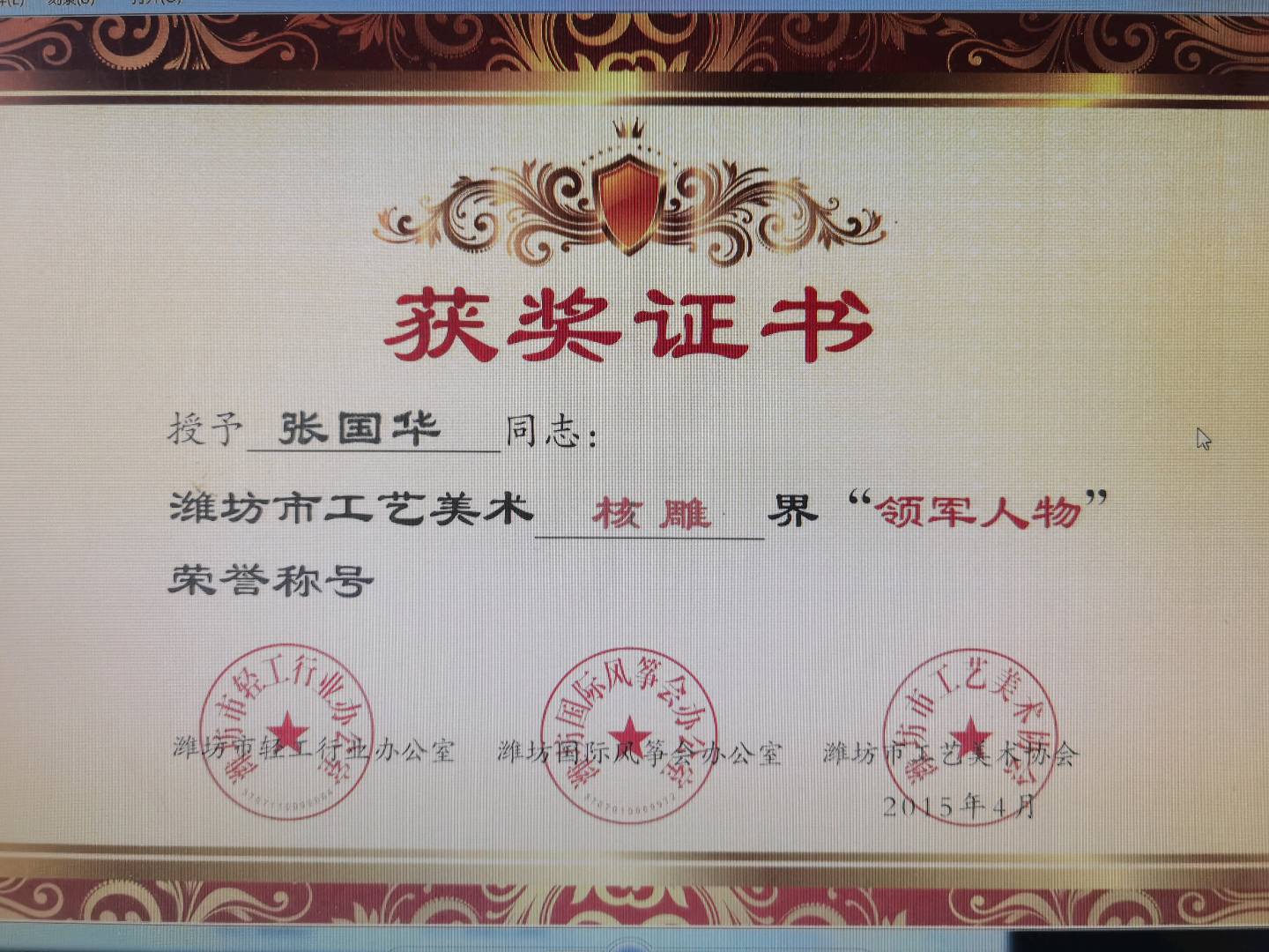 2015年获潍坊市核雕界“领军人物”荣誉称号;