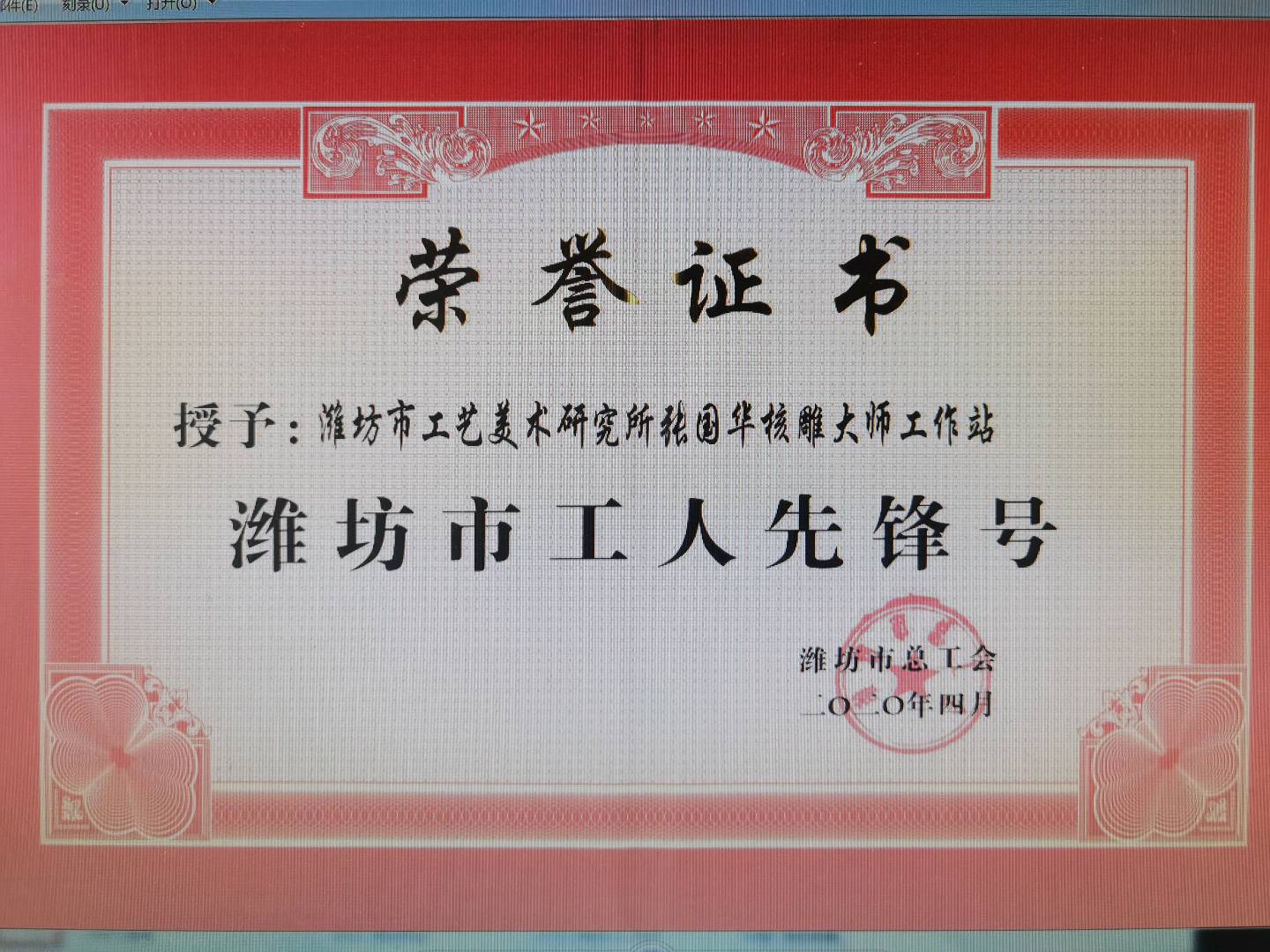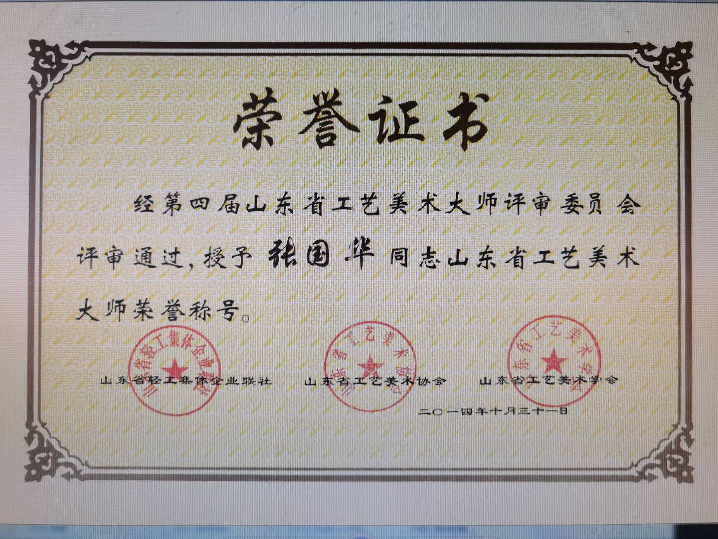 2014年被评为山东省工艺美术大师荣誉称号;