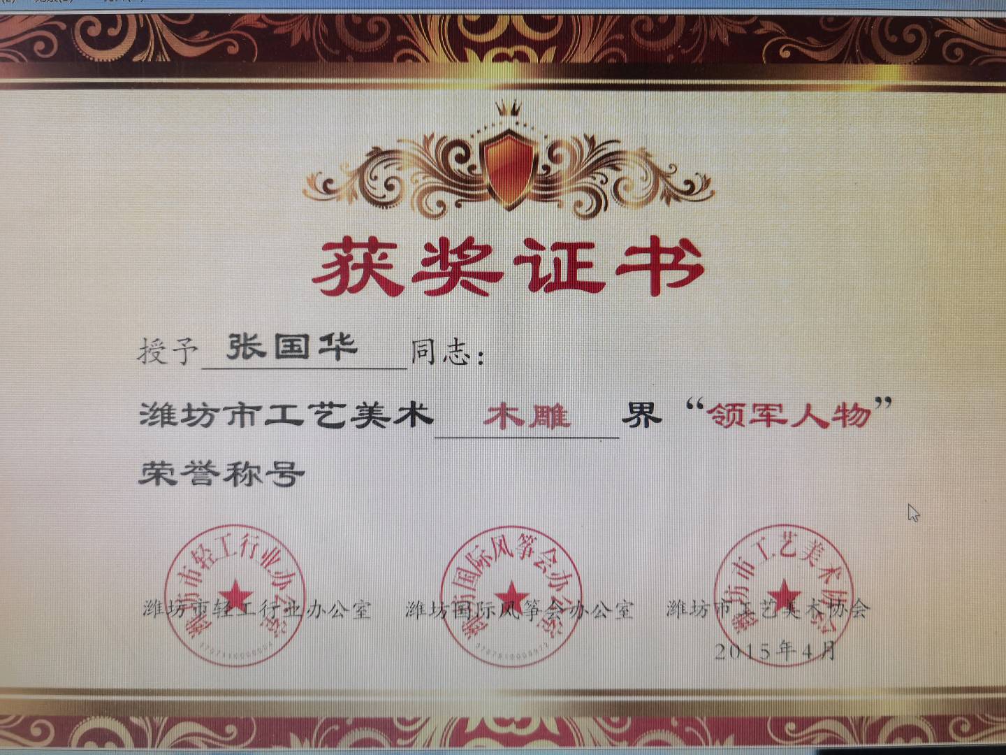 2015年获潍坊市木雕界“领军人物”荣誉称号;