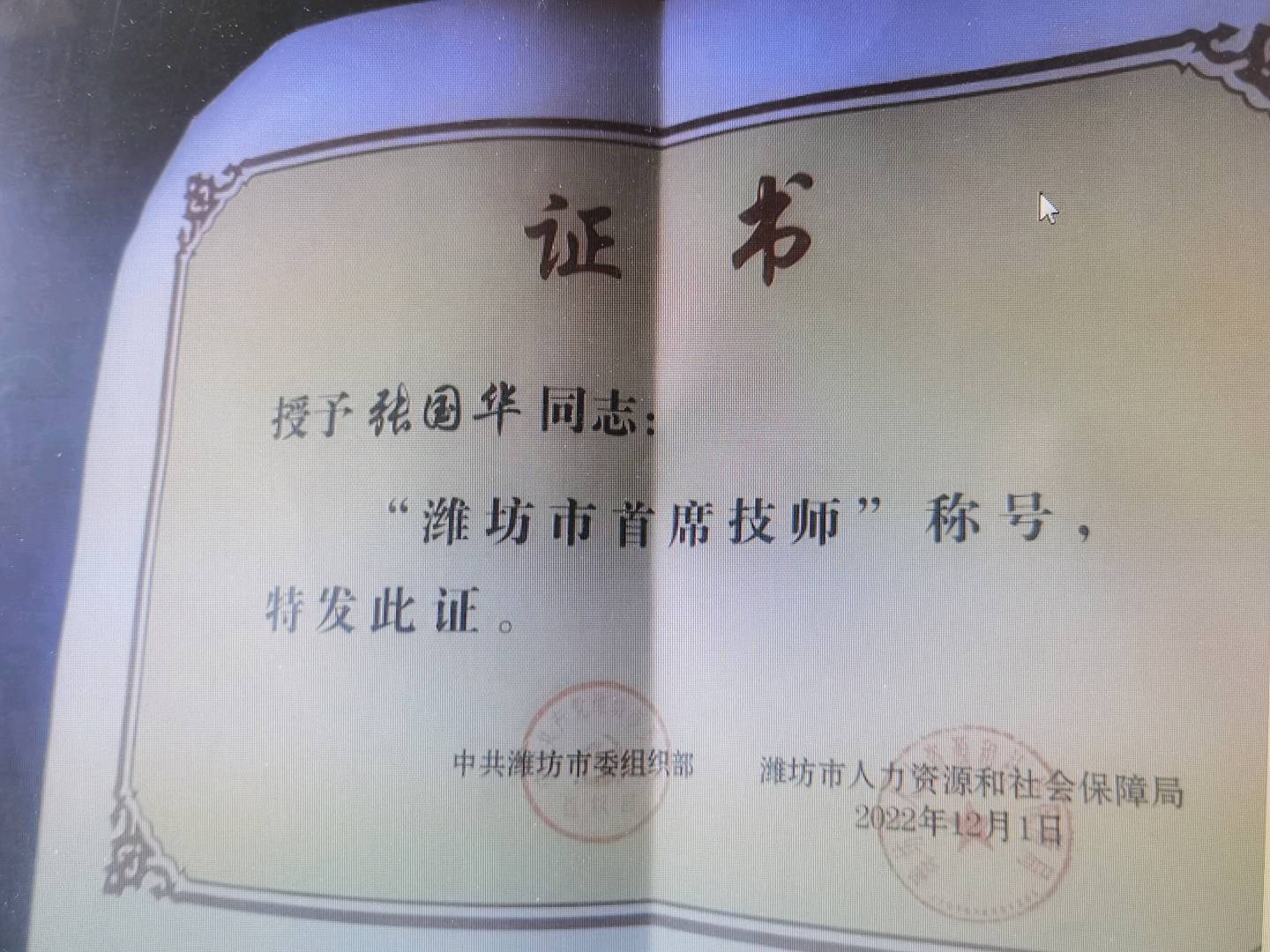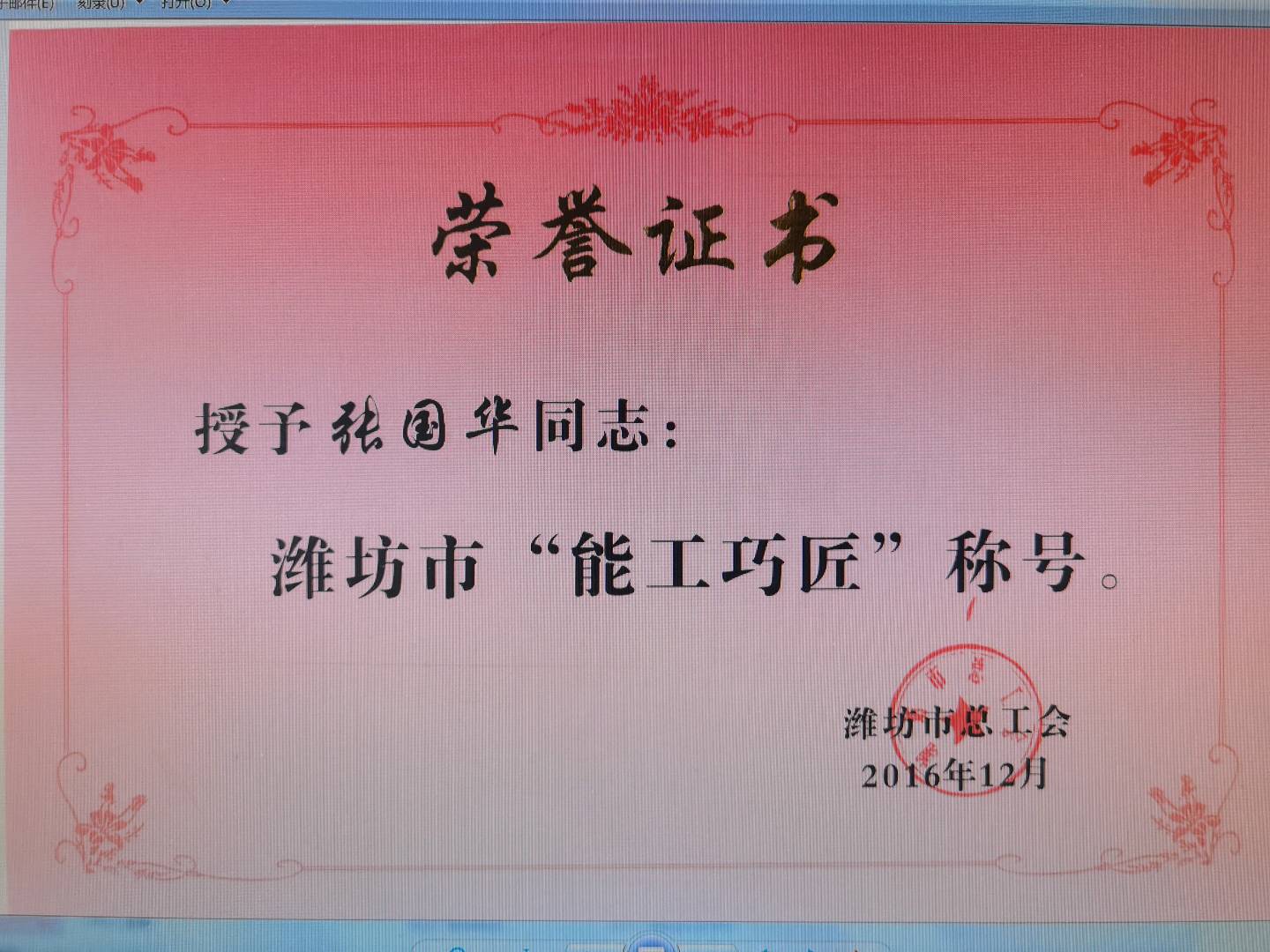 2016年获潍坊市“能工巧匠”称号