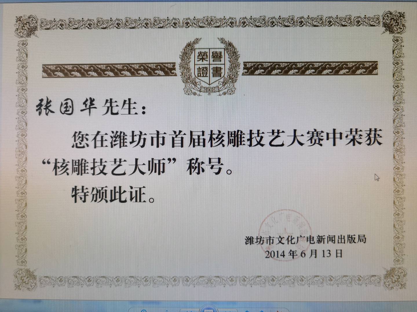 2014年被授予潍坊市“核雕技艺大师”称号;