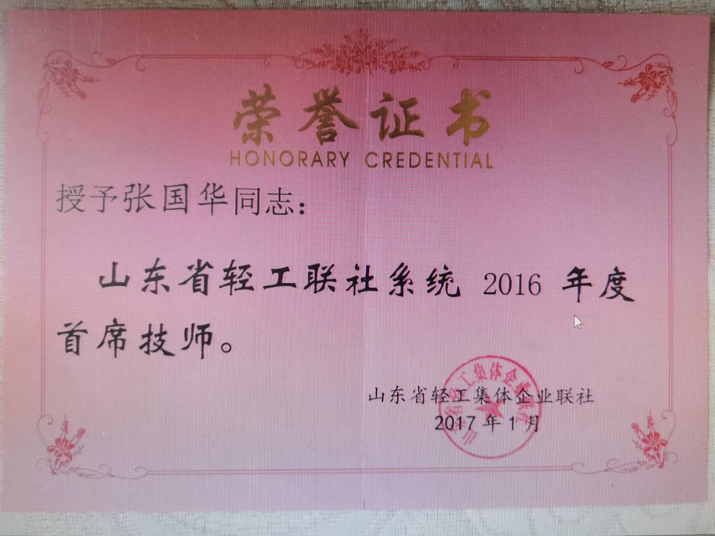 2016年获山东省轻工联社系统2016年度首席技师;