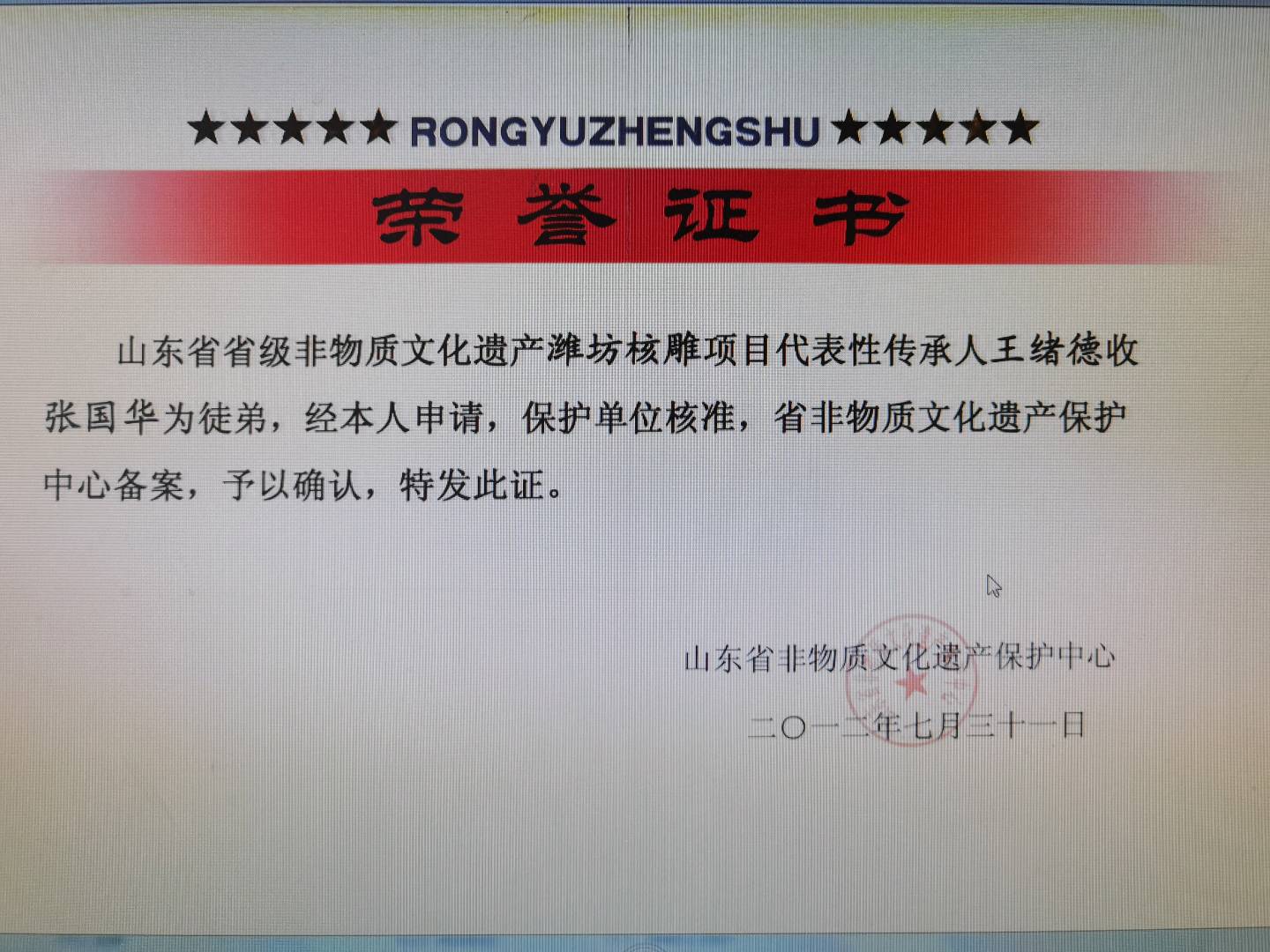 、 山东省非遗保护中心颁发,潍坊核雕国家级代表性传承人王绪德收张国华为徒证书