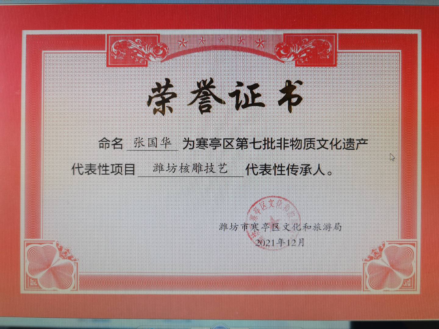、 国家级潍坊核雕技艺区级代表性传承人