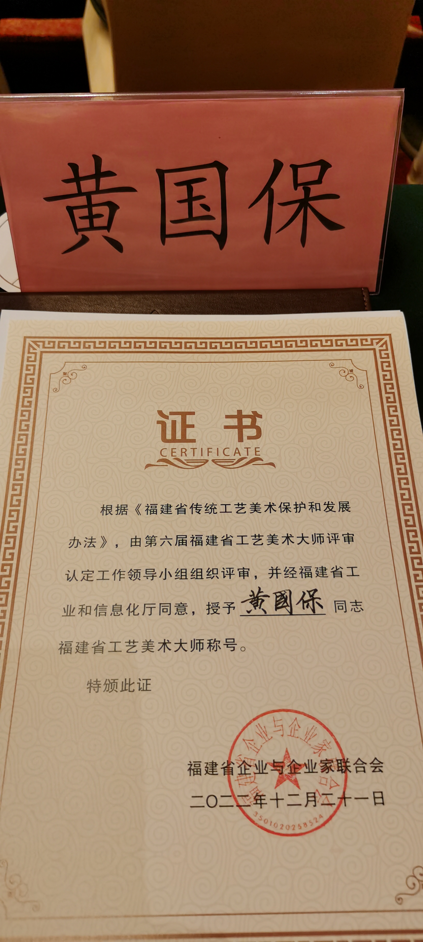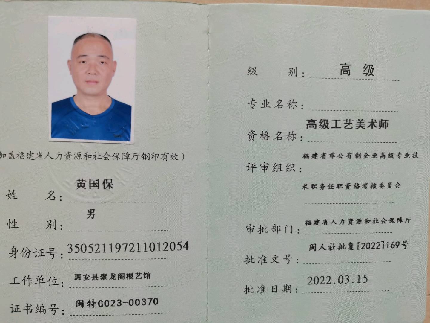 黄国保,1972年生于惠安。大专学历,国家一级高级技师,中级工艺美术师,福建省金牌工人,泉州市工艺美术大师,泉州工匠,泉州高层次第四层次人才,荣获省总工会举办的第二届福建省手工艺技能大赛木竹根雕第一名,2020年福建省总工会百万职工“五小”创新大赛第二名,荣获2020年第五届泉台两岸职工技能大赛第二名,作品屡获国家级大奖,多件作品获闽南缘博物馆永久性收藏。