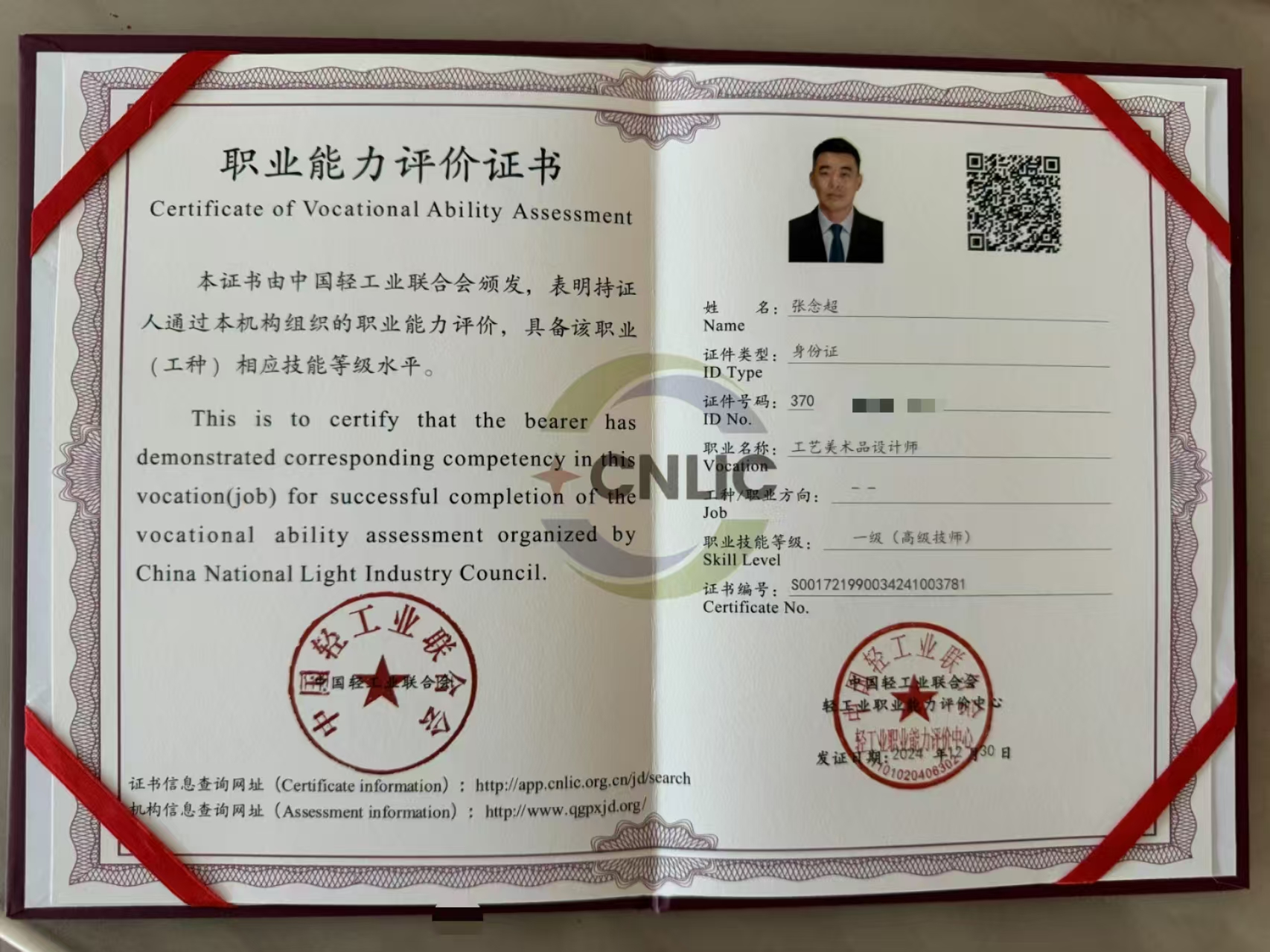 2024年12月30日,由中国轻工业联合会颁发的职业能力评价证书中被评为工艺美术品设计师“一级(高级技师)”;