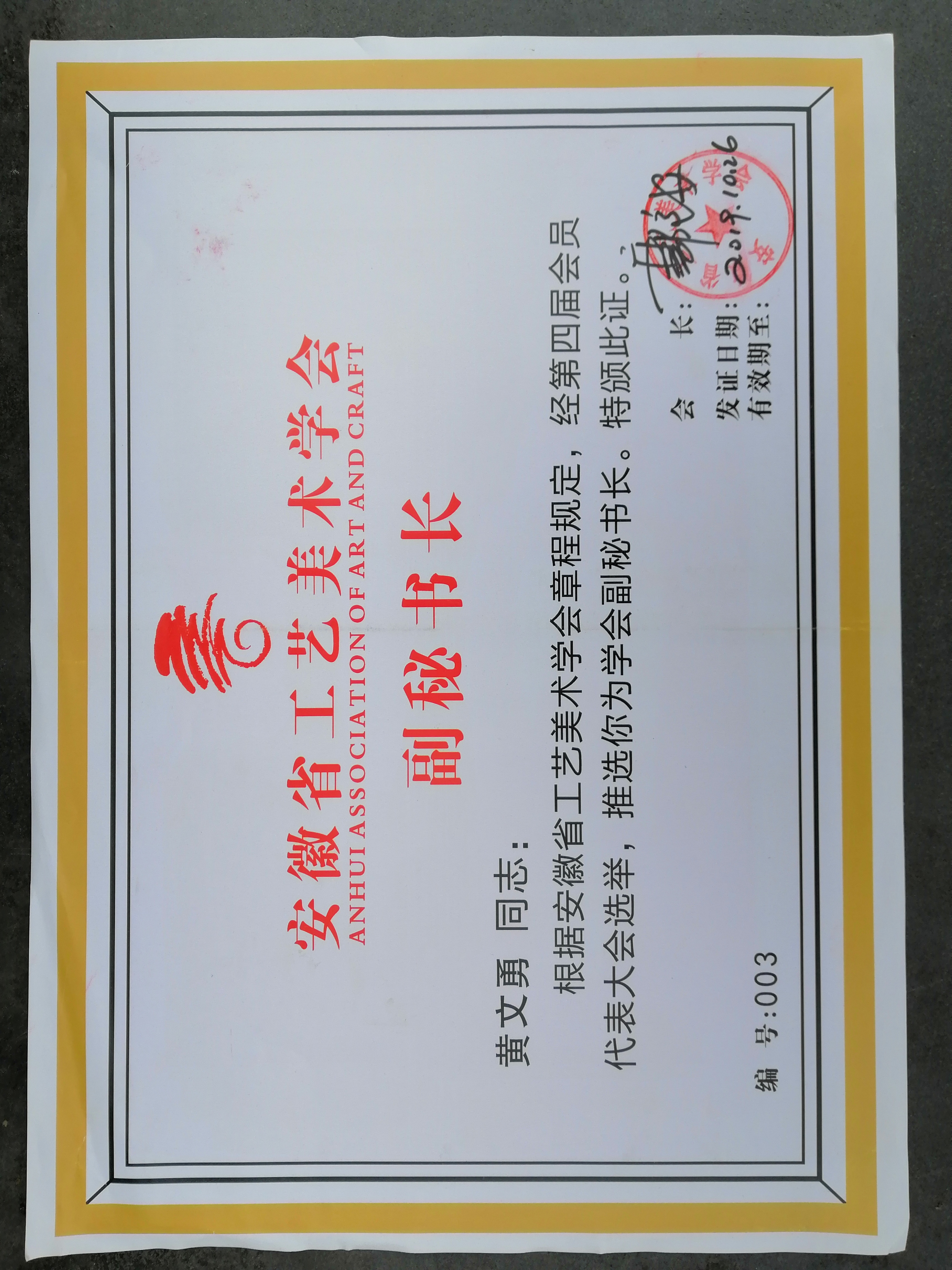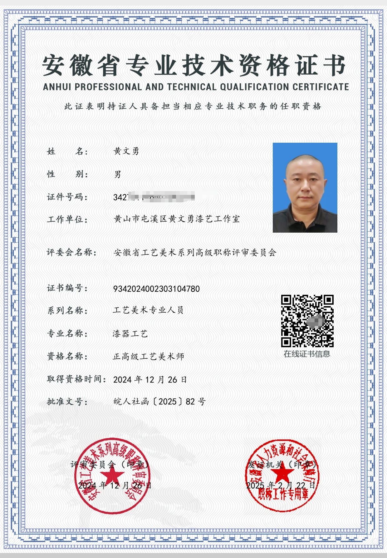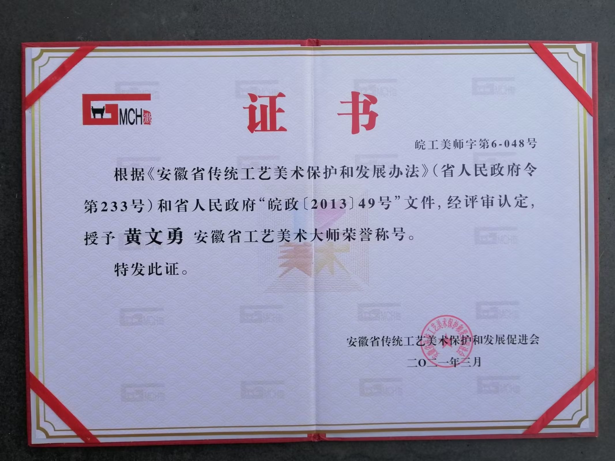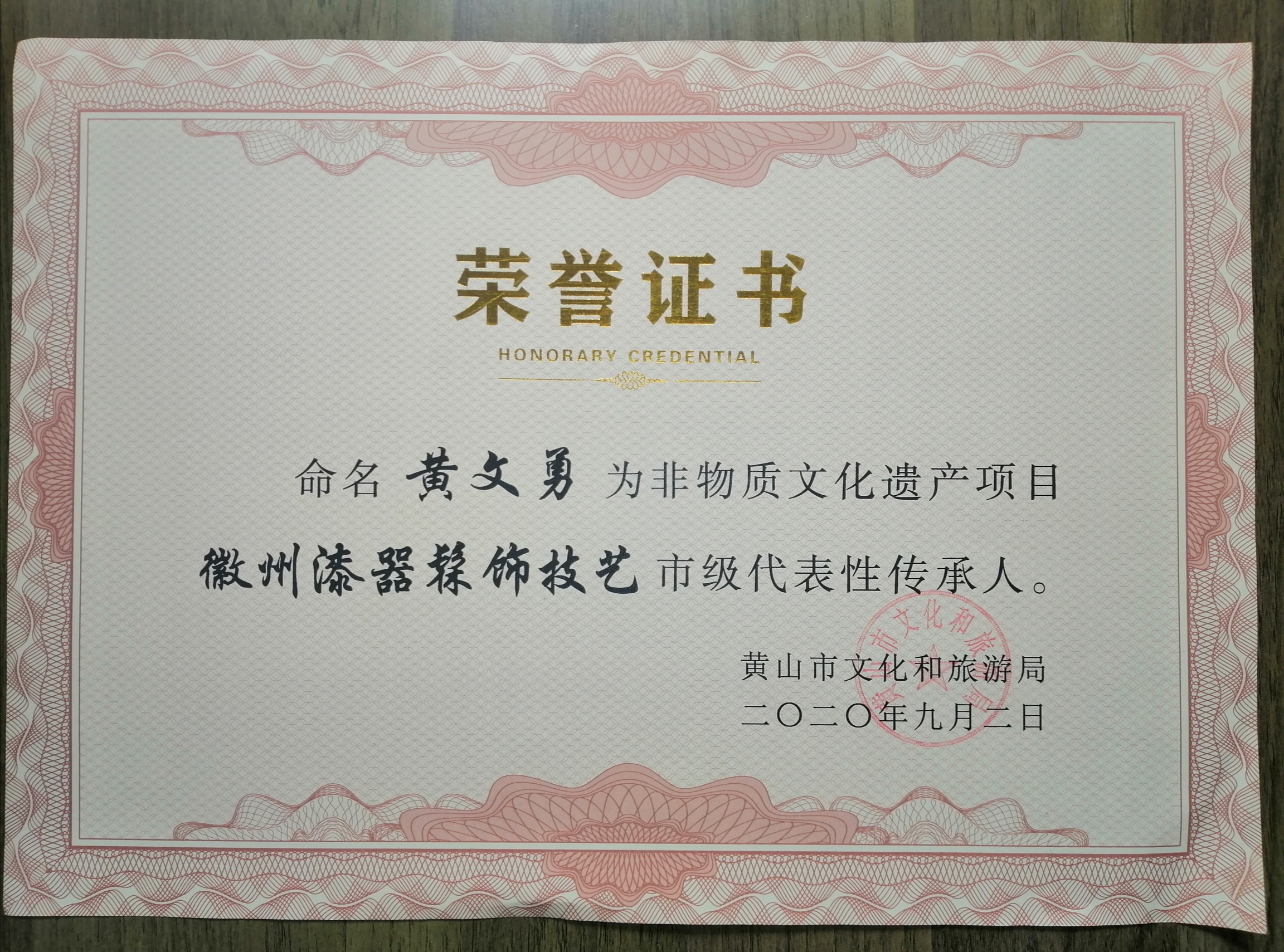 黄文勇,男,1965年出生于安徽省休宁县。正高级工艺美术师,安徽省工艺美术大师,徽州漆器髹饰技艺市级传承人,安徽省美术家协会会员 ,安徽省工艺美术学会副秘书长 ,黄山学院客座教授 ,黑龙江工程学院硕士研究生导师。