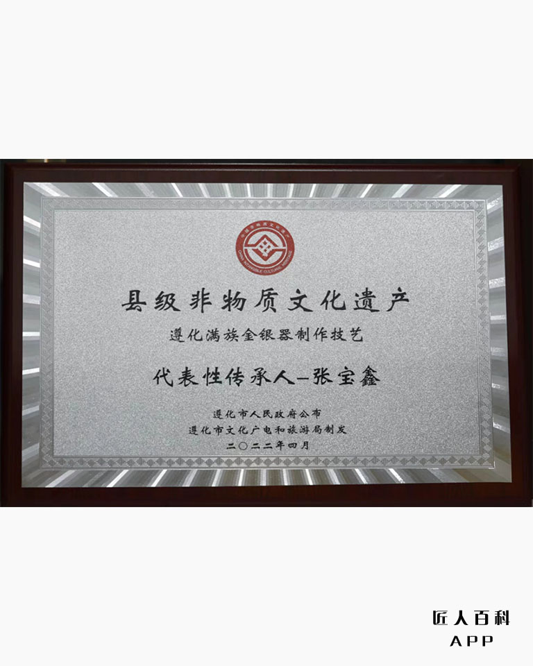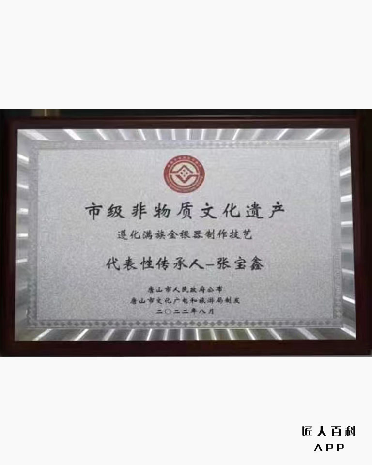 2022年8月获得“市级非物质文化遗产(遵化满族金银器制作技艺)代表性传承人”荣誉称号;