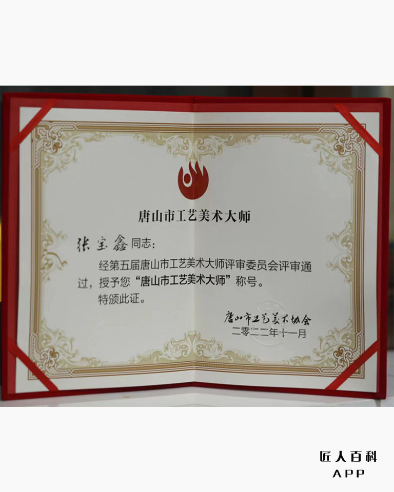 2022年11月获得“唐山市工艺美术大师”荣誉称号。