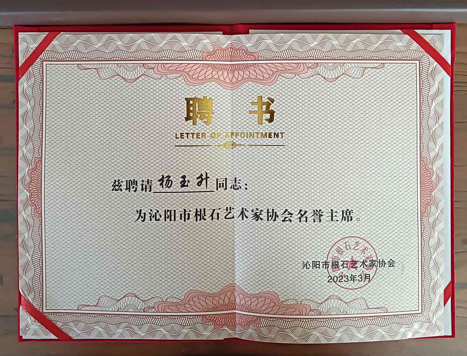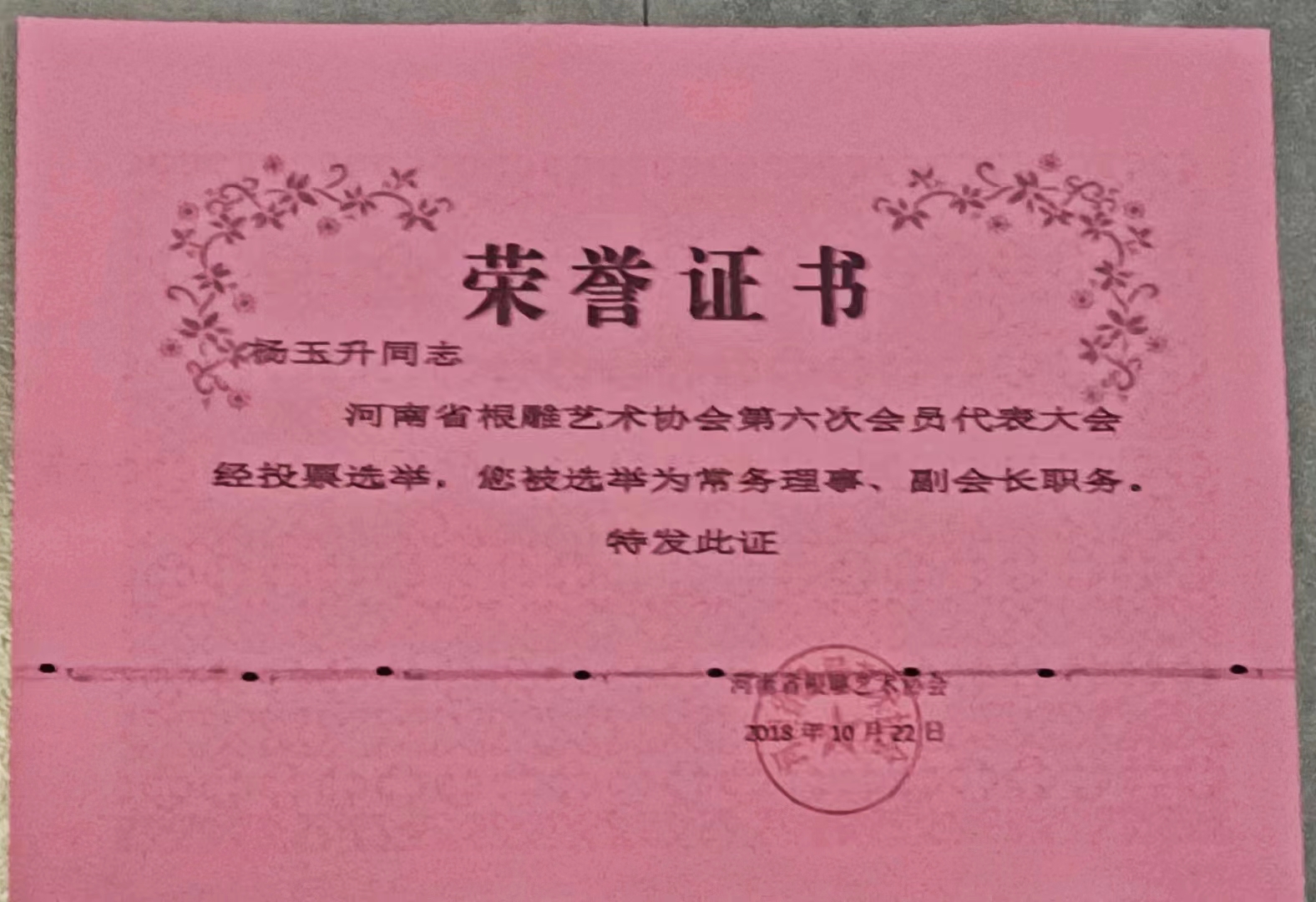 杨玉升凭借作品影响力,担任中国根艺美术学会理事,“三马”学术委员会委员,河南省根雕艺术协会副会长(代理秘书长)等多项职务。“建国七十周年”“建党百年华诞”根雕精品展担责负责人和作品评审组组长。多次带队根艺骨干,到全国各地参加精品展,考察,交流,学习,不仅带动和提高沁阳在全省同行的影响、河南在全国根雕界的影响,也进一步推广了“杨氏根雕”技艺。近千件作品销售全国各地市及香港、台湾地区,使之享誉全国。