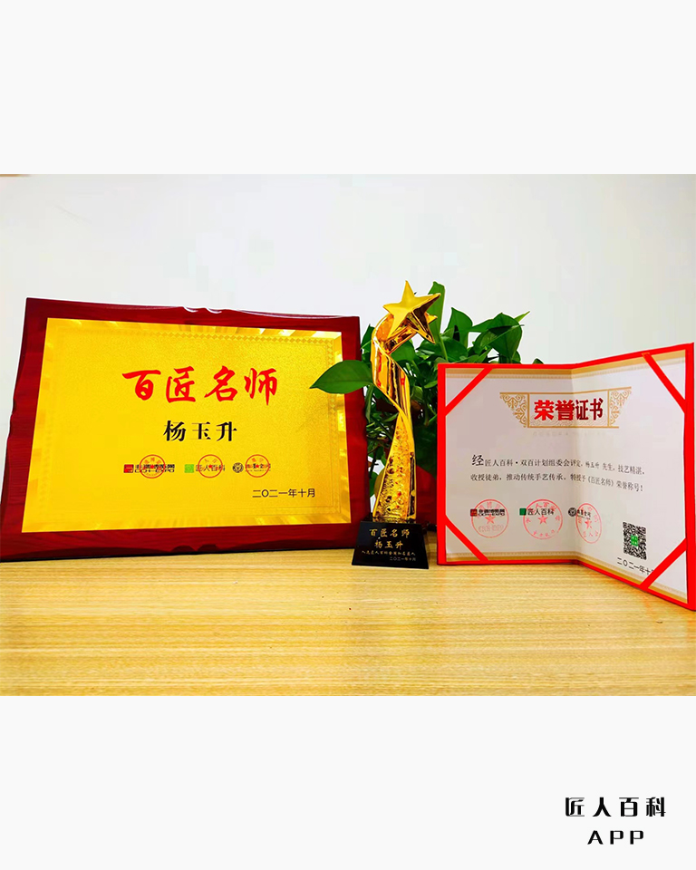 2014年创建“杨玉升根雕艺术工作室”;2018年被焦作市政府授予“焦作市技术能手”荣誉称号,荣获“2019年予匠代表人物提名”奖,2020年获得省级技能大师。“杨玉升根艺美术技能大师工作室”列入省政府建设项目。2021年10月,被评为“省级技能大师工作室”。并带徒16人,其中,获得河南省高级民间艺术师两人,工艺美术大师一人,省高级根艺美术师六人,根艺美术师三人。