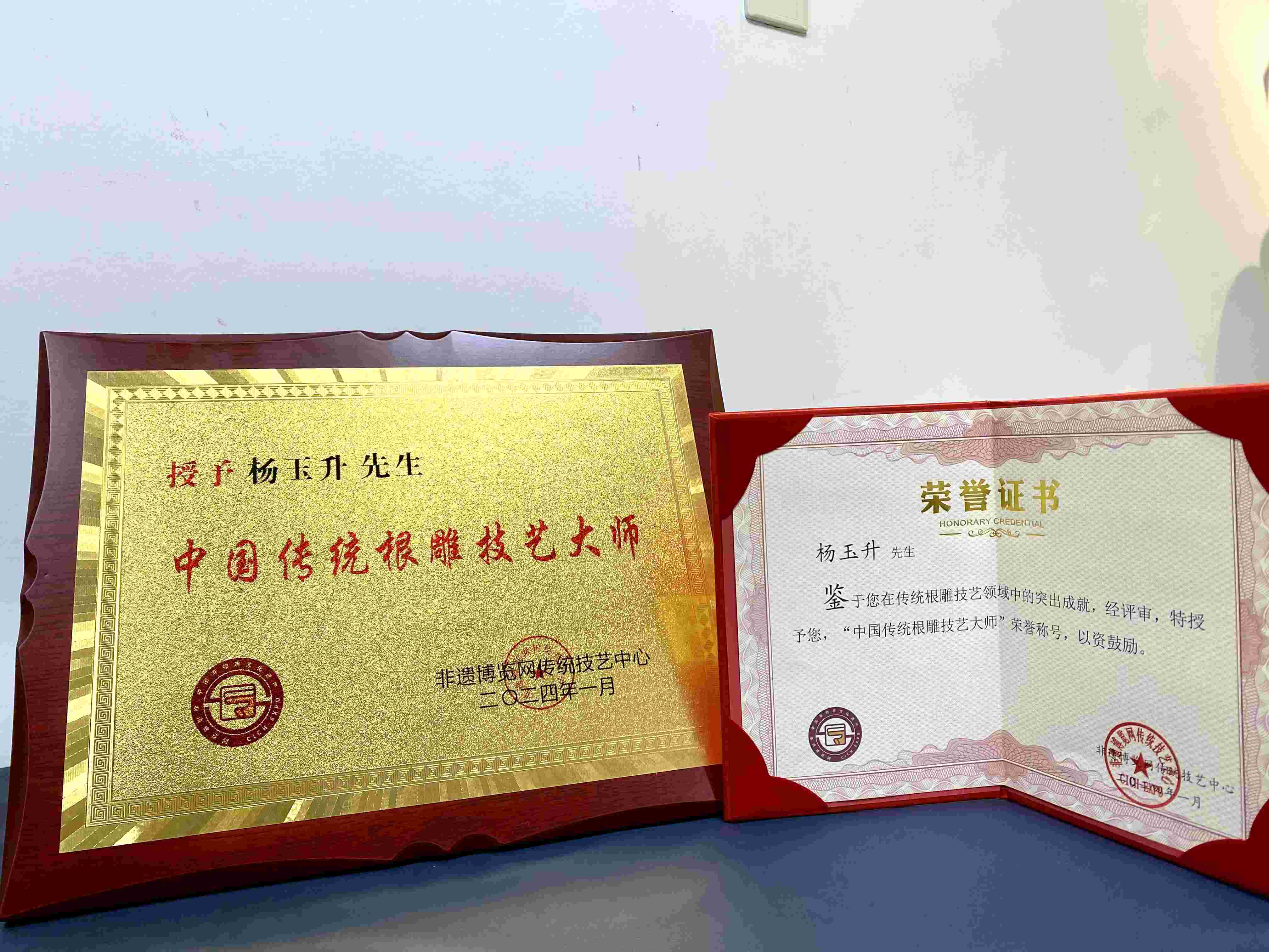 “杨氏根雕”技艺,孕育发展于豫西北焦作沁阳境内,其形成深受中原文化滋养,是中国“根艺”的组成部分。该技艺是杨玉升先生(1954年8月生)继承其高祖杨明信(生卒不详)创立形成的一门传统技艺,距今己有二百年历史。该技艺坚持“化腐朽为神奇,变废为宝”的创作原则,经杨玉升半个多世纪坚持不懈的学习、钻研、传承和发展,日臻完善,形成了比较完整的技艺体系。所创作品善于利用根材自然形态,巧借天然,因材施艺,纯手工技艺创作而成。作品奇趣自然,浑然天成,独一无二,不可复制。其作品在国家、省市大赛展出中多次获奖。获国家级金(特级精品)银铜奖9个,河南省金奖(特级精品奖)16个。作品《惊梅》在首届中国非物质文化遗产文创大赛中获银奖;作品《大道.生生》荣获河南省第五届民间艺术(工艺美术类)金鼎奖。杨玉升本人2019年入围予匠代表人物。获得中国根艺美术学会建会三十年“奉献杯”,被评为河南省民间艺术带头人。“杨玉升根艺美术工作室”2020年被省政府命名为省级技能大师工作室建设项目。