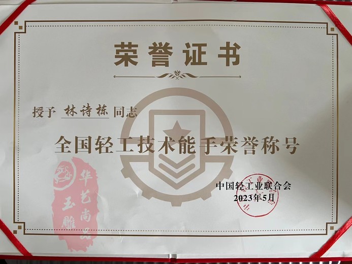 2023年获得全国轻工技术能手荣誉称号;