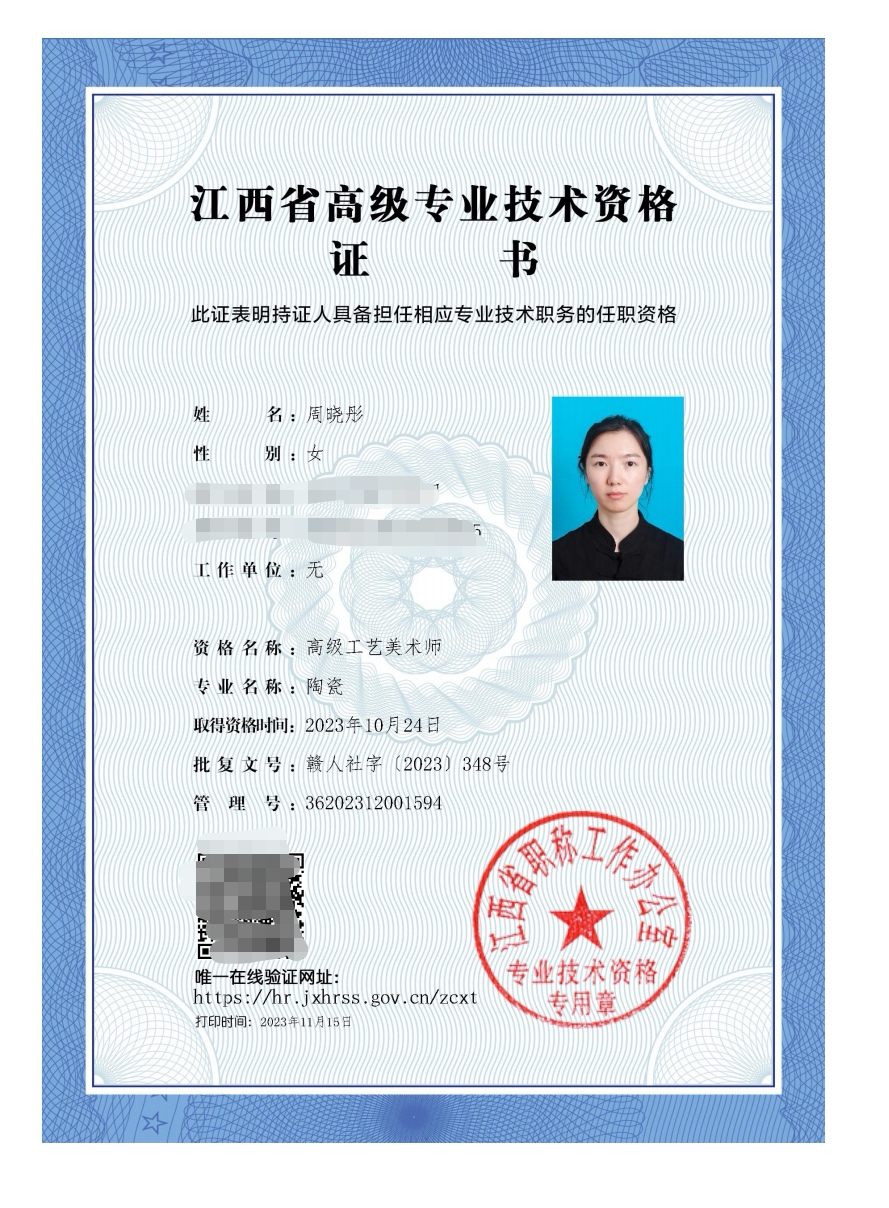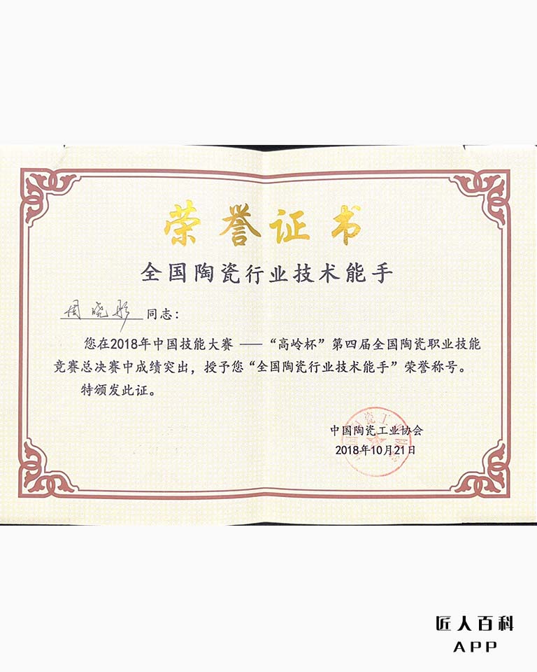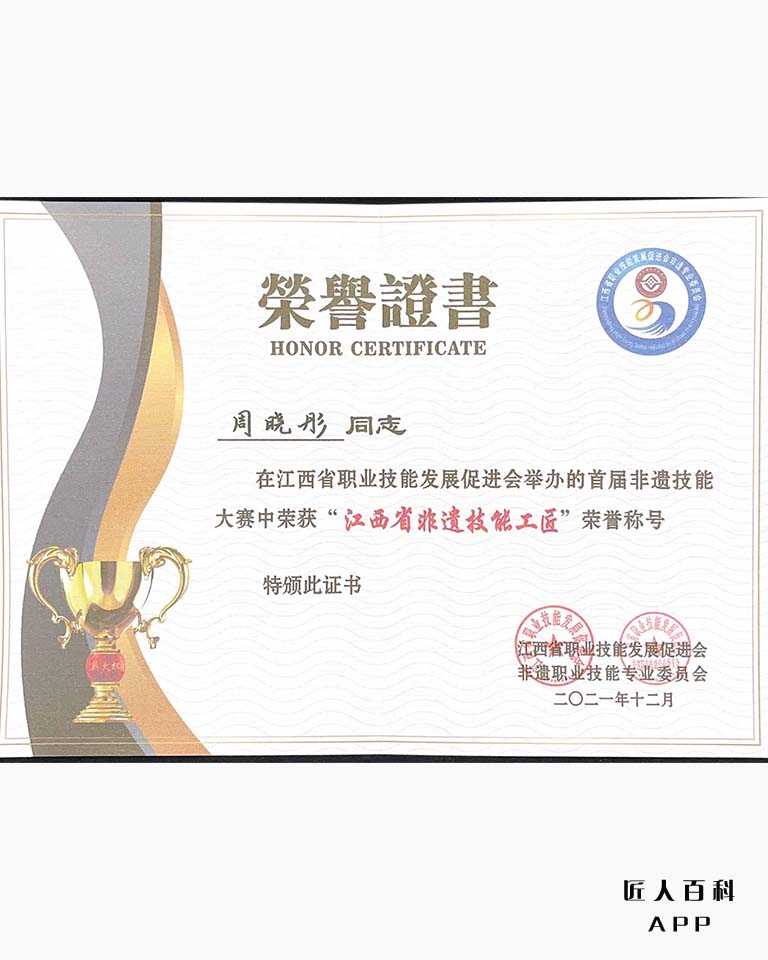 • 2021 年:在江西省职业技能发展促进会举办的首届非遗技能大赛中,荣获“江西省非遗技能工匠”荣誉称号。