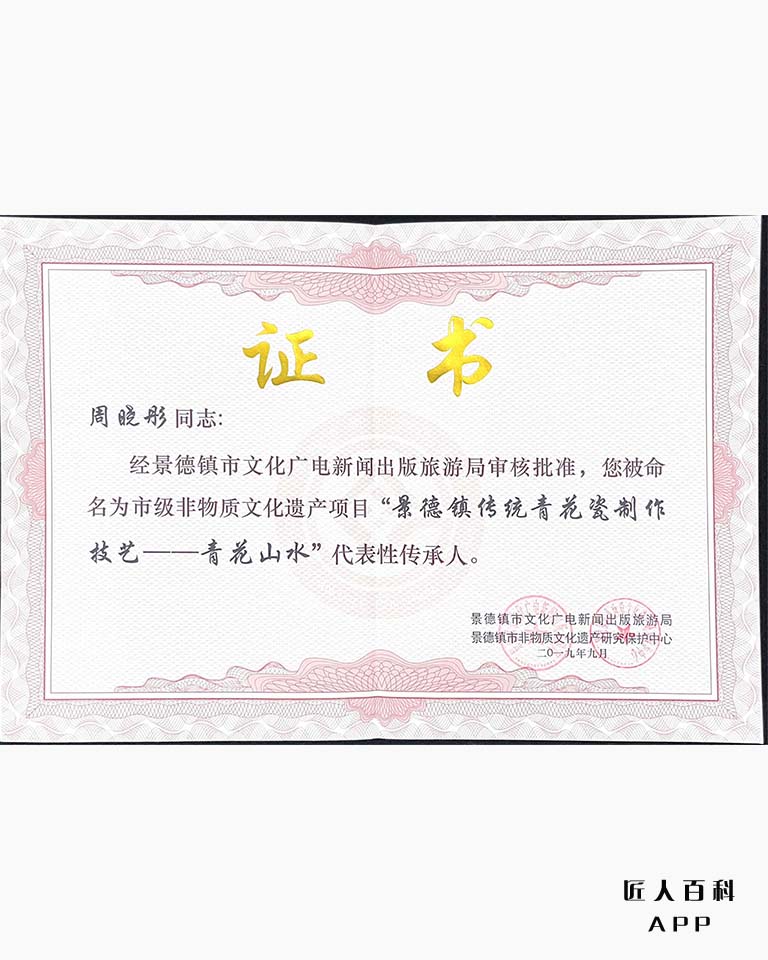 • 2019 年:经景德镇市文化广电新闻出版旅游局审核批准,被认定为市级非物质文化遗产项目“景德镇传统青花瓷制作技艺 - 青花山水”代表性传承人。