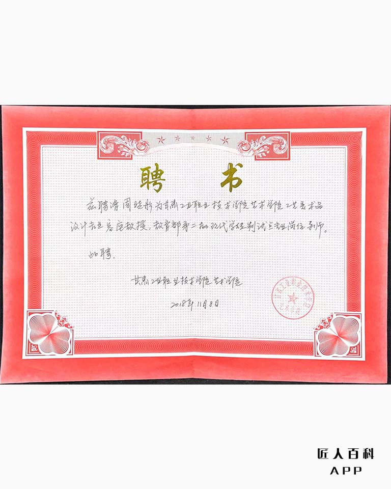 ◦ 10 月,在“高岭杯”第四届全国陶瓷职业技能竞赛中,获“全国陶瓷行业技术能手”荣誉称号;同年,被甘肃工业职业技术学院艺术学院工艺美术品设计专业聘为客座教授,兼任教育部第二批现代学徒制试点专业岗位导师。