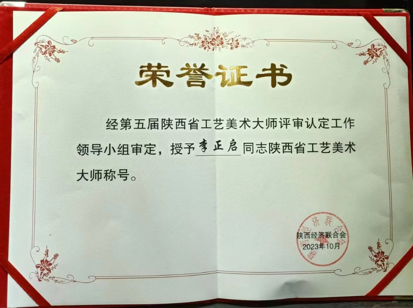 2023年10月经第五届陕西省工艺美术大师评审认定工作领导小组评定,授予“陕西省工艺美术大师”称号;