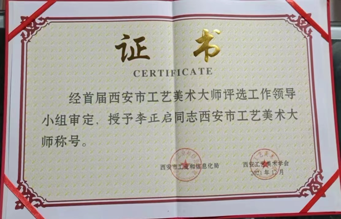 2021年12月经首届西安市工艺美术大师评选工作领导小组审定,授予“西安市工艺美术大师”称号;
