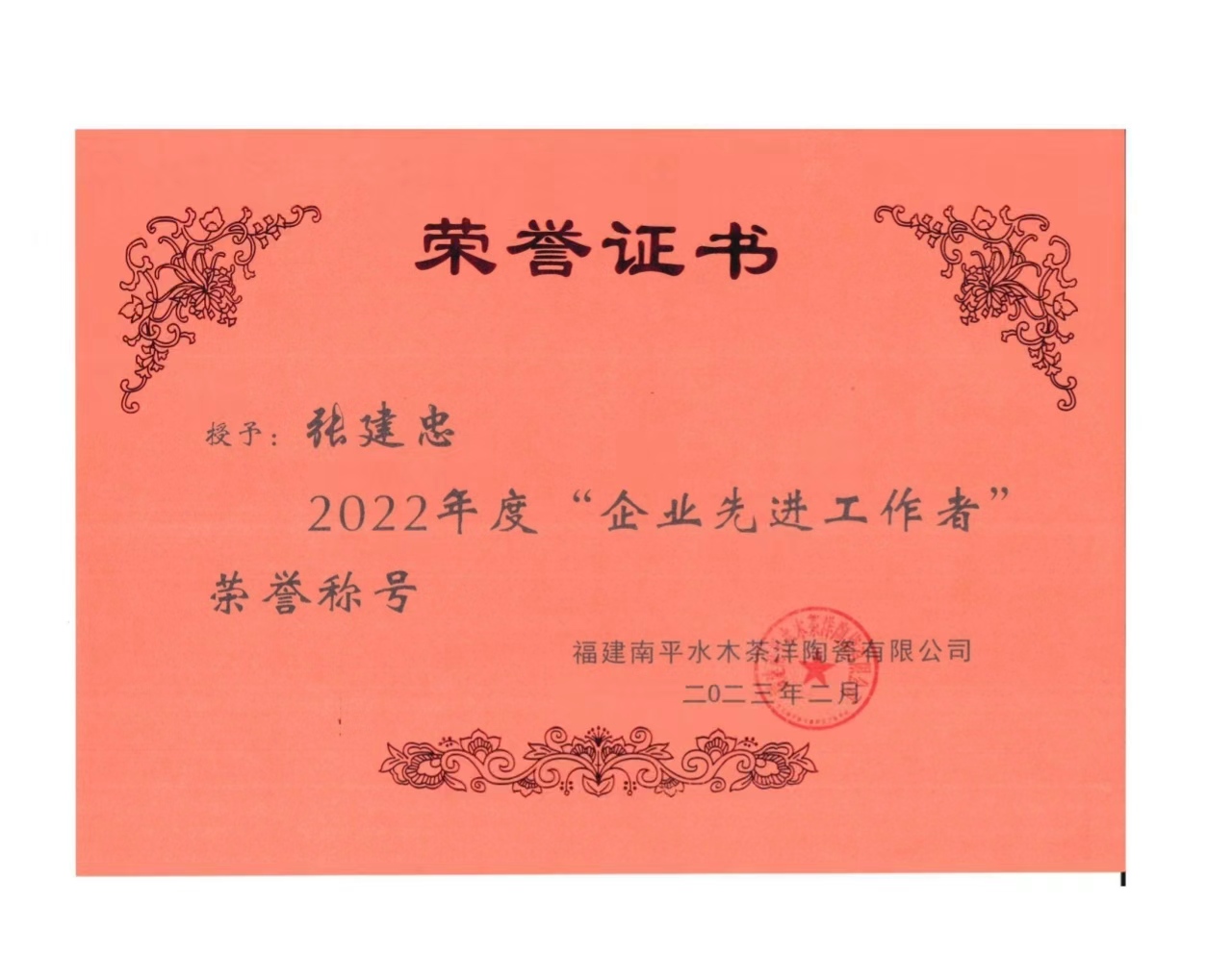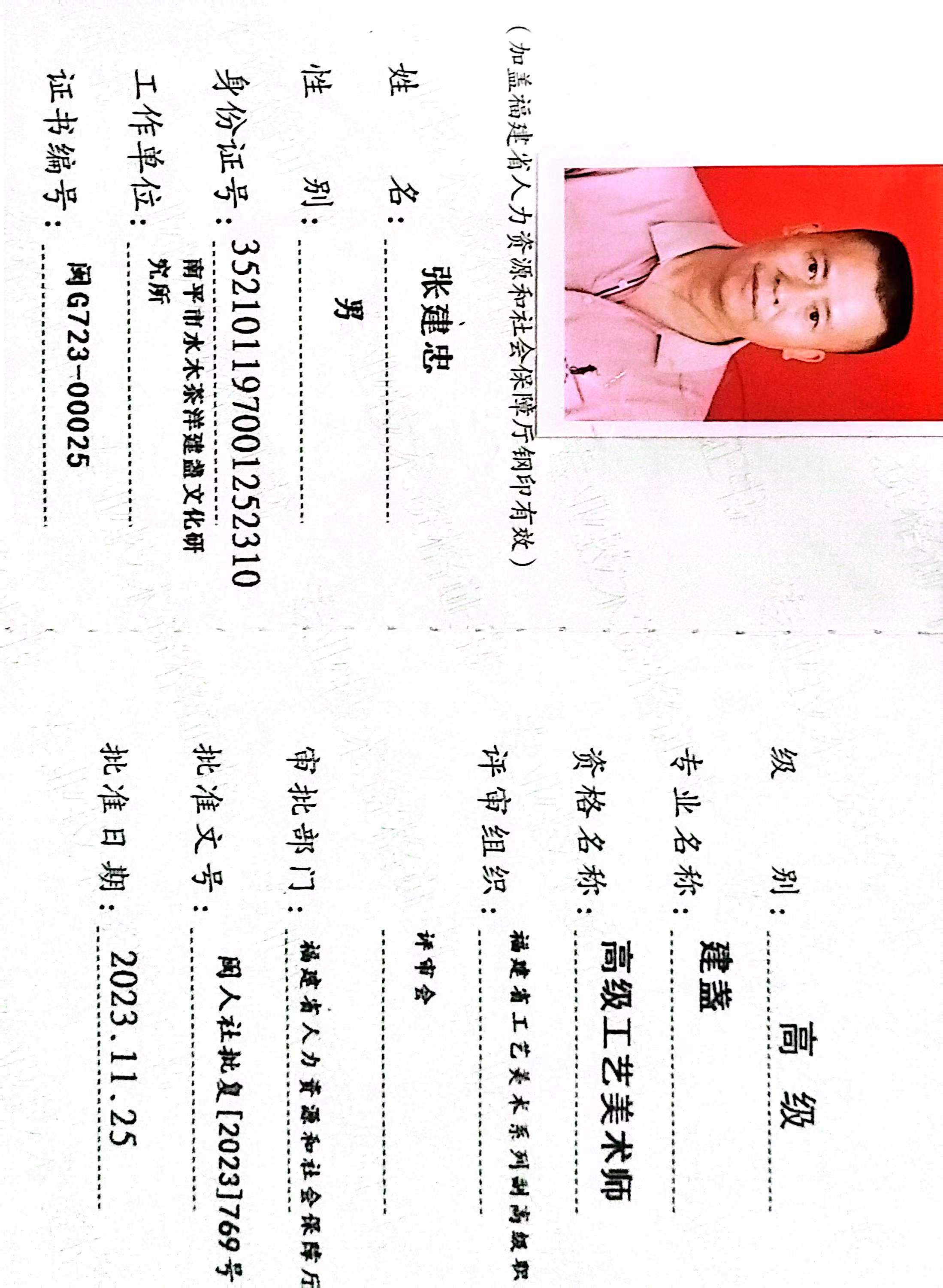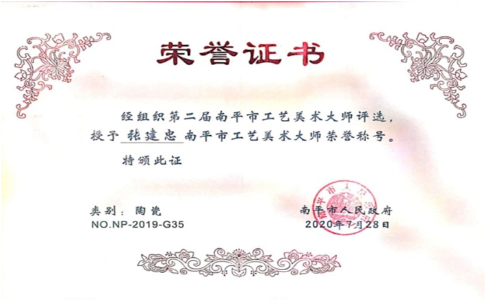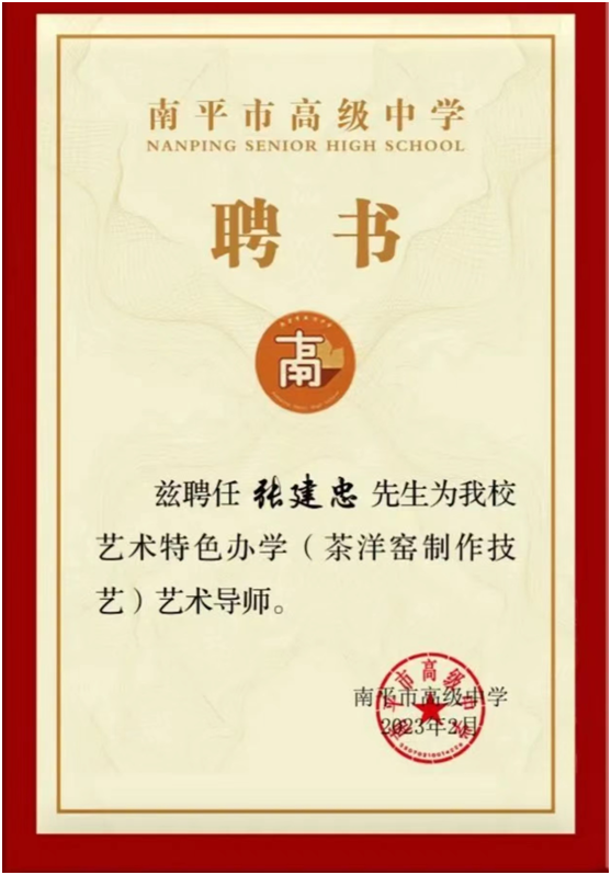 张建忠,南平市民盟成员、延平区政协委员、南平市延平区科技特派员、国家级陶瓷考评员、一级技师、闽北工匠、福建省工艺美术名人、高级工艺美术师、南平市延平茶洋窑制作技艺代表性传承人、南平市工艺美术大师、南平市第一批民间工艺美术名艺人、福建省企业家联合会理事、福建省商务礼品协会副会长、福建省工艺美术协会会员、南平市工艺美术协会常务理事、南平市延平区茶洋窑陶瓷协会会长、南平市延平区乡村振兴促进会副会长、南平市延平区企业家联合会副会长、南平市延平区新阶联常务理事。