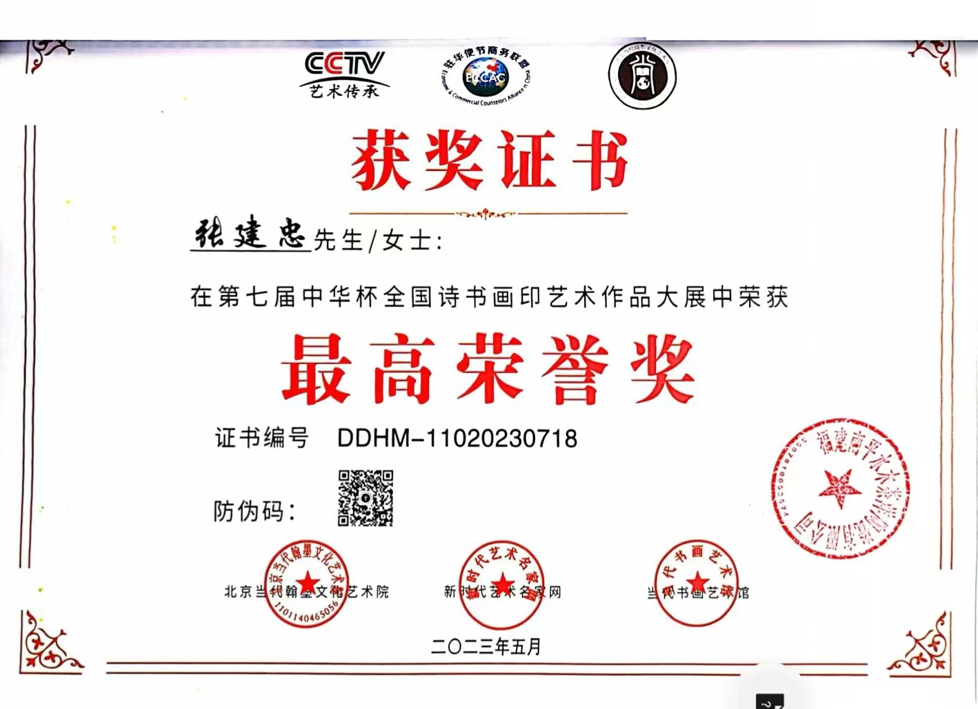 、 第七届中华杯艺术作品大展最高荣誉奖