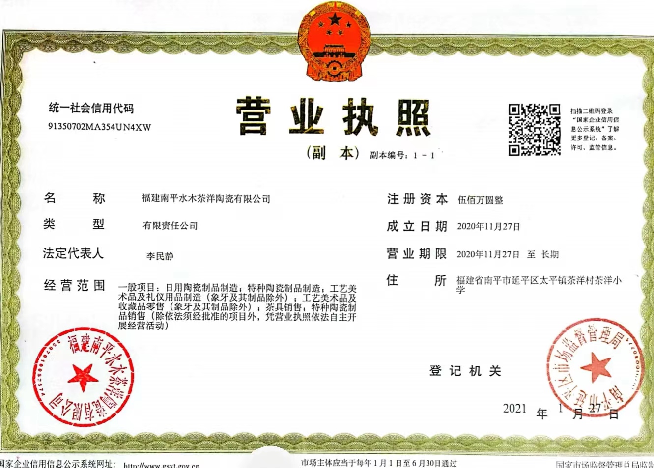 2019年1月成立南平市延平茶洋窑陶瓷有限公司任总经理。目前带茶洋窑徒弟23人19人已过茶洋窑非遗传承人其中6人已过市级传承人。