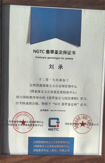 2019年7月,以优异成绩考取“NGTC翡翠鉴定师”证书;
