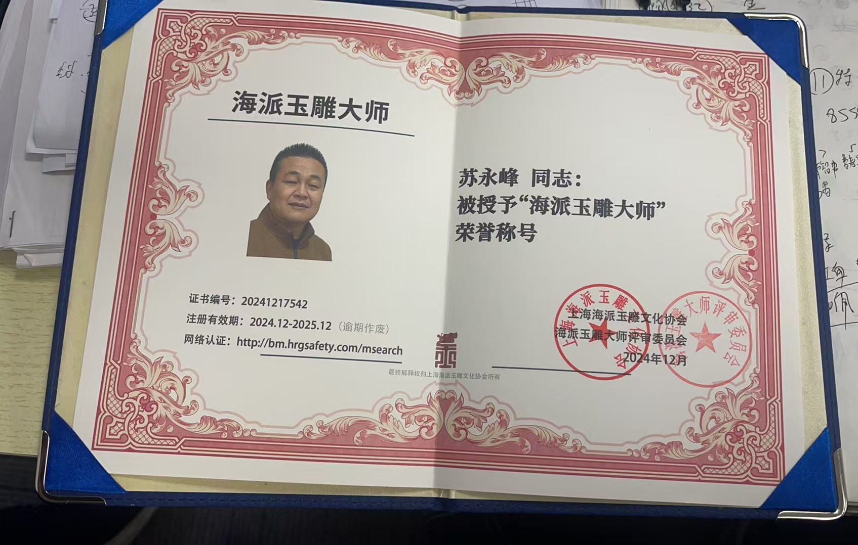 苏永峰,秉性淳朴、与人为善,好学习、善钻研。1991年去扬州邗江玉雕厂,跟尊师张福康老师学习。1995年厂子解散后和师兄石爱国一起研究玉雕。2003年在苏州相王弄开个人工作室。