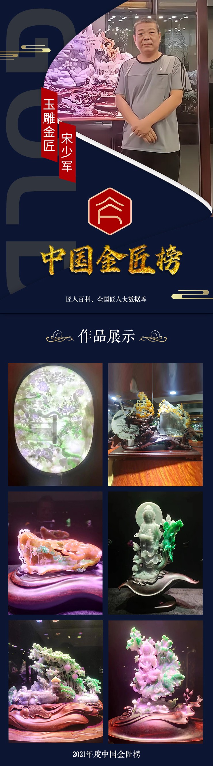 宋少军,中华玉雕艺术大师,1967年出生于中国玉雕之乡-河南省镇平县。中国玉石雕刻艺术大师,开封大学客座教授,中国工艺美术师、国家一级美术师、国家职业技能鉴定高级考评员,中国一级/高级工艺品雕刻师,中国一级/高级贵金属首饰珠宝玉石鉴定师、中国轻工珠宝玉石鉴定师、评估师,河南省工艺美术大师,河南省轻工大工匠,河南省玉石雕刻大师,中华玉雕工艺师,五一劳动奖,全国职业信用评价(玉雕)中华传统工艺大师,中国玉雕大师网上榜大师、中国玉雕大师网推荐大师、全国职业信用评价非遗(玉雕)高级技艺传承师,中国轻工珠宝首饰中心专家委员,中国轻工珠宝首饰中心(广东)职业技能培训基地主任。多年来创作出众多优秀的作品,深受广大爱好者的一致好评与收藏。