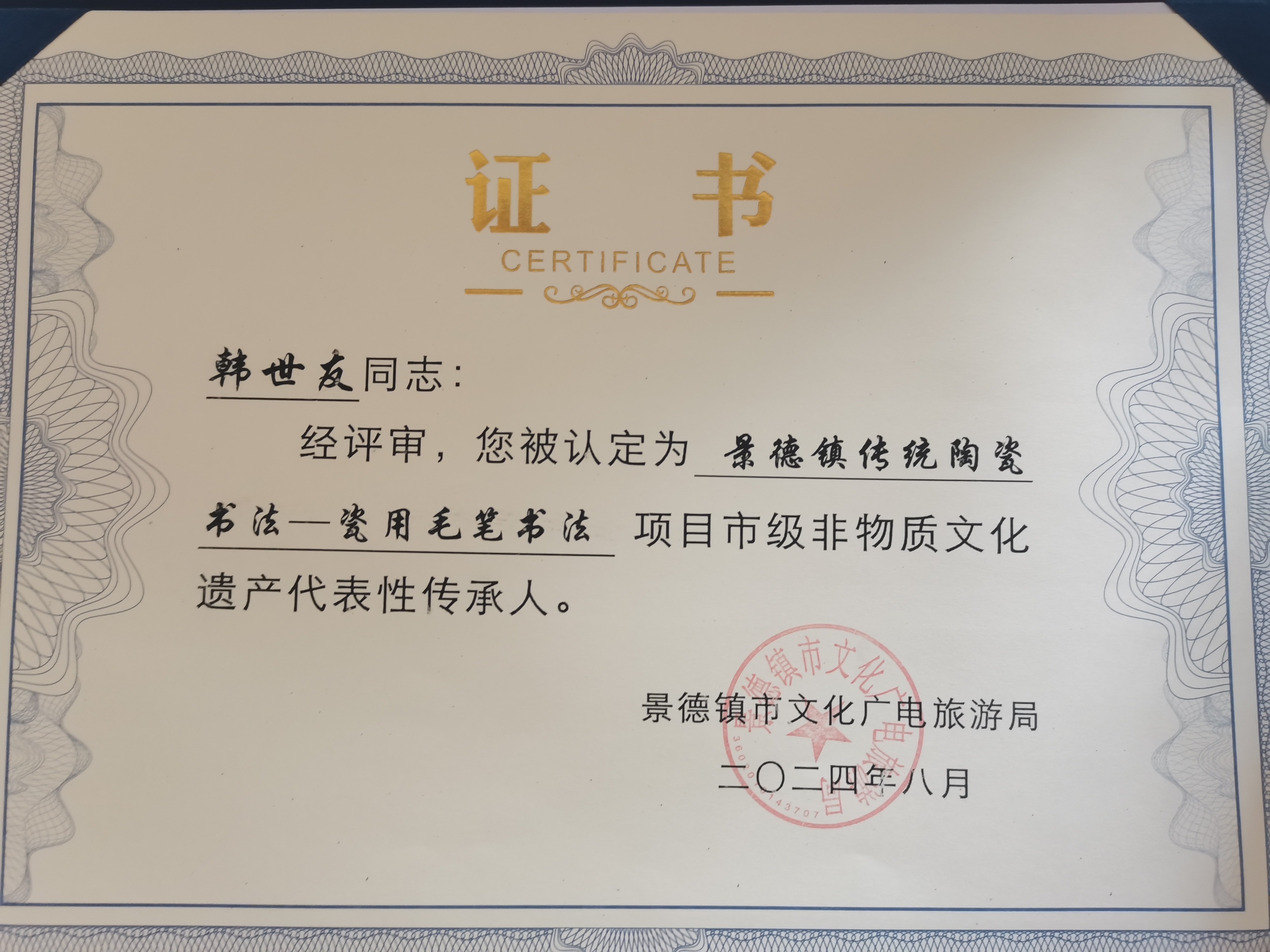 韩世友深耕陶瓷书法艺术,其技艺融传统笔法与瓷艺特质于一体,形成独具韵味的艺术风格。他精通多种书体,笔力遒劲而气韵灵动,将高温颜色釉、青花料等陶瓷材料与书法创作结合——釉料在窑火中流淌变幻,与笔势相互生发,形成“墨韵釉色共生”的独特艺术效果。其作品既承袭古代碑帖法度,又赋予陶瓷媒介当代审美表达,彰显出“瓷上书道”的工艺难度与美学深度。