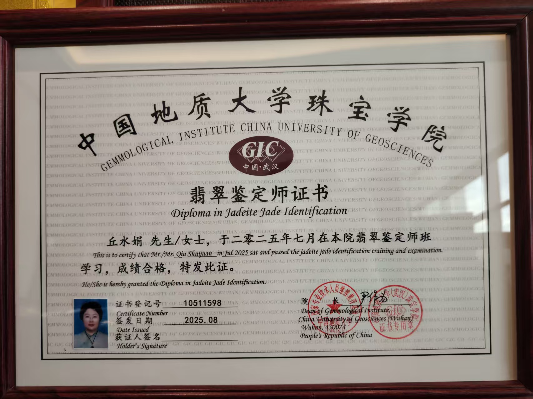 丘水娟,翡翠鉴定师、评估师,女,仁驰珠宝有限公司创始人,生于广东揭阳翡翠世家,从小跟随长辈学习翡翠相关知识及经营家族翡翠商铺,师从中国地质大学珠宝学院包德清教授及中国工艺美术大师、中国玉石雕刻大师张炳光先生。本科毕业于广州美术学院中国画专业,课余时间兼修书法学专业,珠宝翡翠继续教育于中国地质大学(武汉)珠宝学院,毕业后创办书画工作室及继承管理经营家族翡翠商铺。